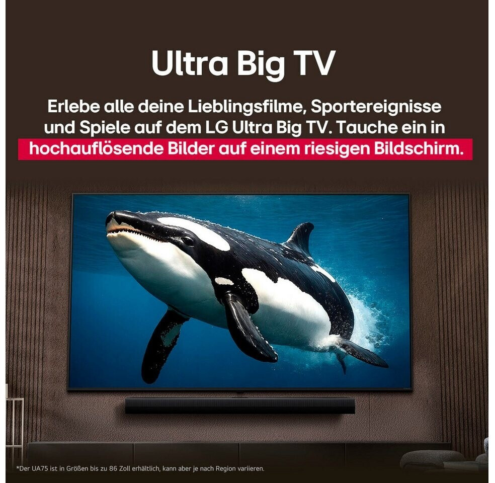 Der LG 75UA74006LB ist ein beeindruckender 75-Zoll LED-Fernseher mit gestochen scharfer 4K UHD-Auflösung und HDR-Unterstützung für lebendige Farben und tiefen Kontrast. Das integrierte webOS Smart-TV bietet einfachen Zugriff auf beliebte Streaming-Dienste wie Netflix, YouTube und Amazon Prime Video.