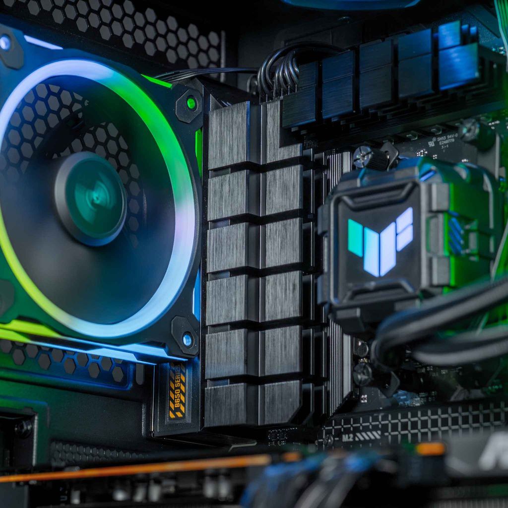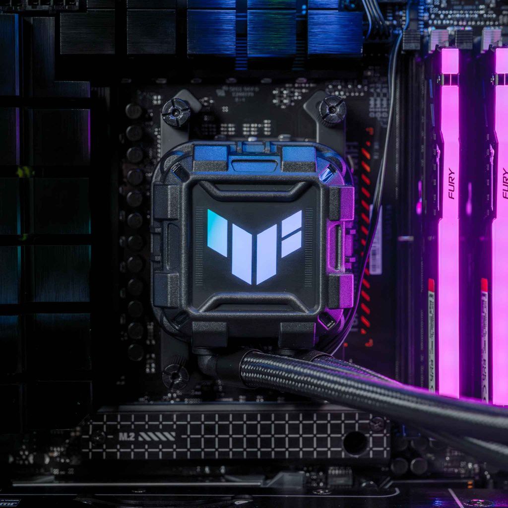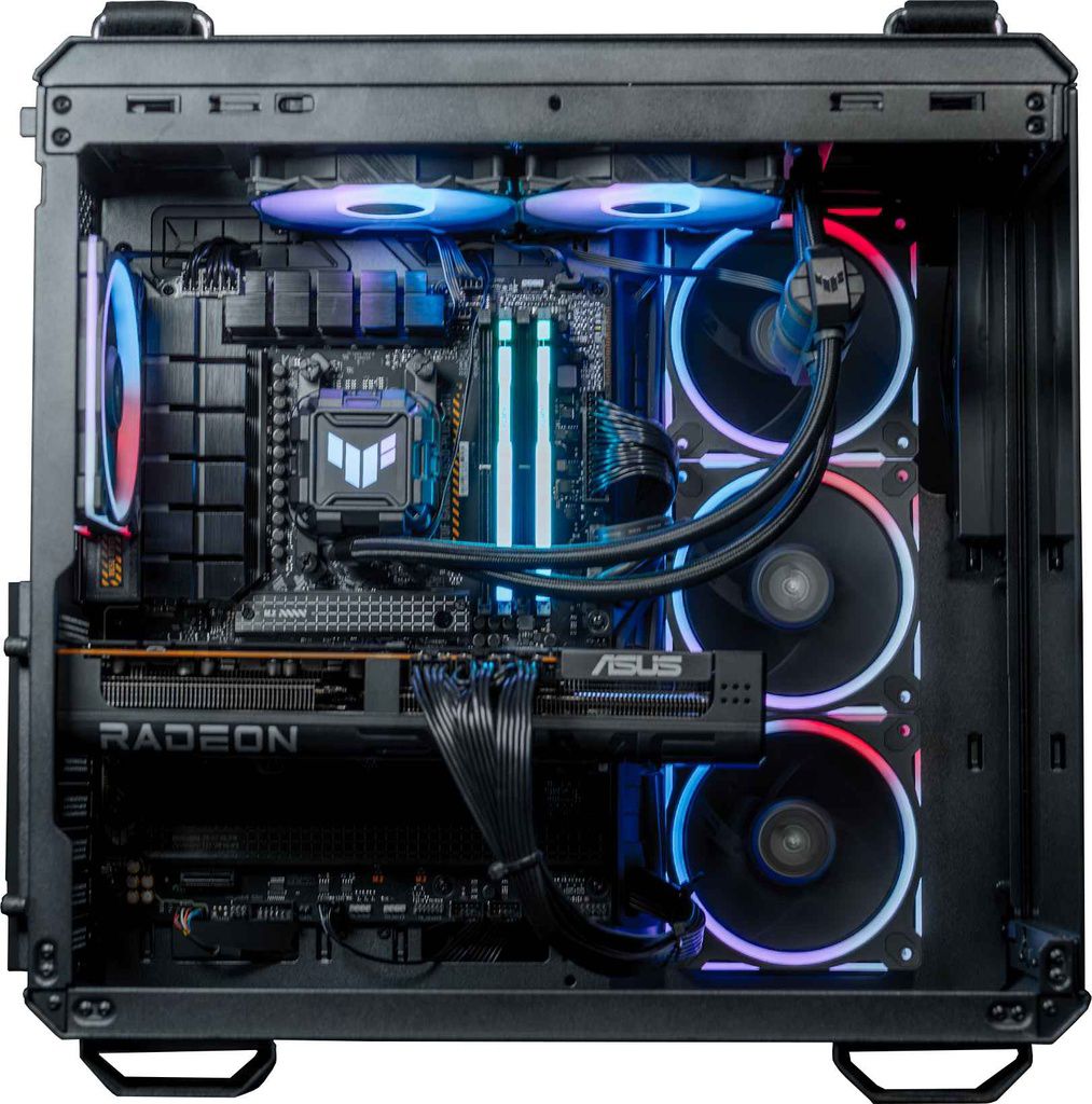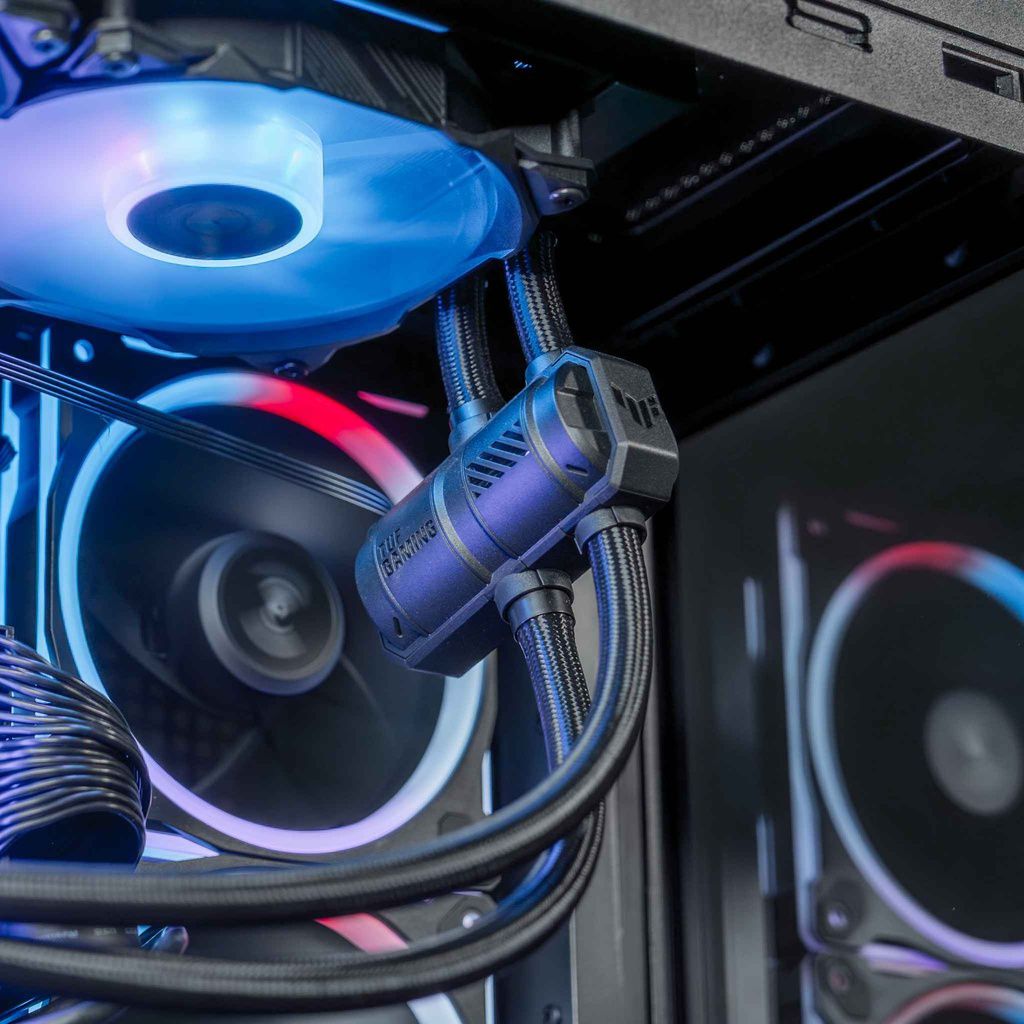 • Gehäuse: ASUS-Tower mit Flüssigkeitskühlung und Seitenteil aus gehärtetem Glas
